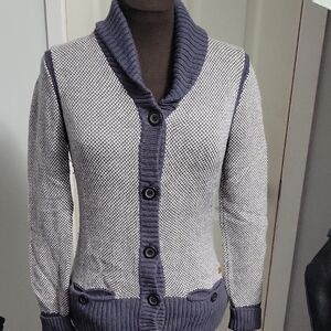 Very cute vintage cardigan with knit collar and tie knit pom Pom detail. Mohair blend.