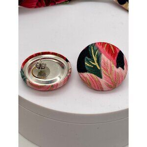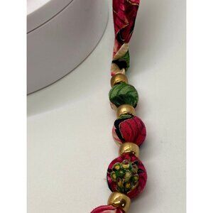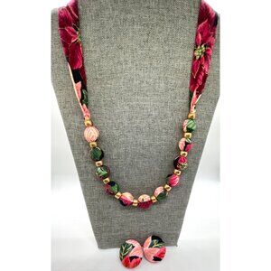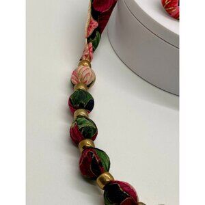 Vintage 80's fabric covered beaded necklace with matching earrings. This set is well made with a gorgeous floral/leaf motif in pales pinks, deep reds and various greens. What a great set for any occasion but would be very nice in fall and Christmas time.