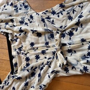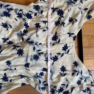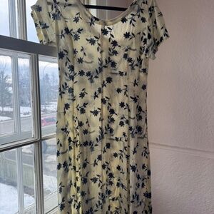 Flattering white and navy blue vintage floral sundress with back tie. Hits below the knee on me (I’m 5’7”).