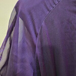 Comfortable yet formal, this 1980s dress has a stretchy black sheath (with shoulder pads!) under an iridescent purple shear overlayer. Scalloped edges with thin wiring make the shear move beautifully. Optional matching floral belt. Size 10
