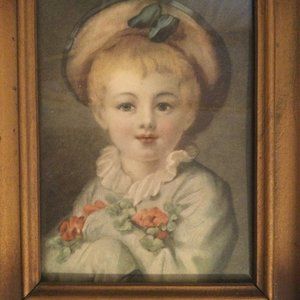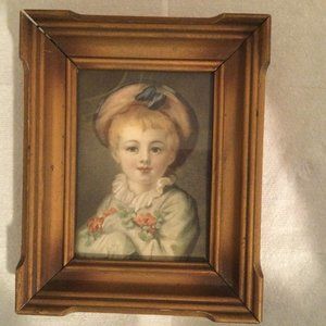 It is a small art wall decor, a vintage print in a vintage wood frame. The print is a portrait of a child. It is small art home decor.