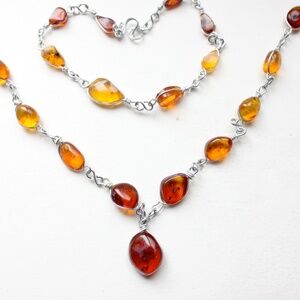 Vintage natural amber wired gemstone necklace and bracelet set. The parure is composed of hand wired genuine amber natural resin gemstone. The necklace has a pendant with a larger amber gemstone. Hook clasp.