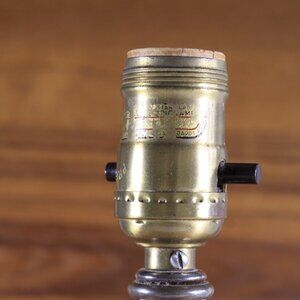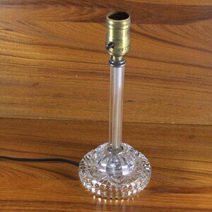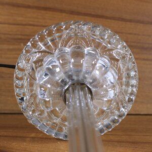 A glass base vintage table lamp. No bulb, no shade. The black wiring looks good. Takes one of those shades that would ´clip´ onto the bulb. Size: 28 cm tall