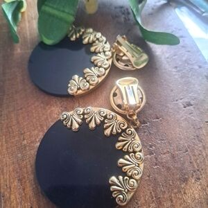 These vintage clip-on drop pendant earrings, with their striking gold and black color combination, appear to be constructed from a blend of metal and plastic. The gold likely forms the base and embellishments.This pairing of metal and plastic was common in vintage jewelry design, allowing for both intricate detailing and affordability. The metal provides the necessary weight and structure, while the plastic adds visual interest and variation in color and texture, creating a unique and eye-catching accessory. t
