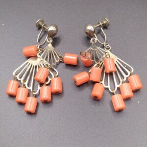 Vintage gold tone layered Fan earrings with orange plastic beads
