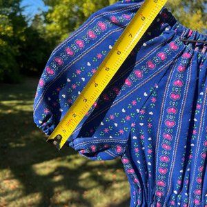 Cotton peasant-style maxi-dress. Dark blue with charming pink/green/white floral and heart print. Elastic neckline and sleeve cuffs. Short (9"/22.75cm) raglan sleeves. Handcrafted, mid 1970s. Machine stitched ruffled hem.