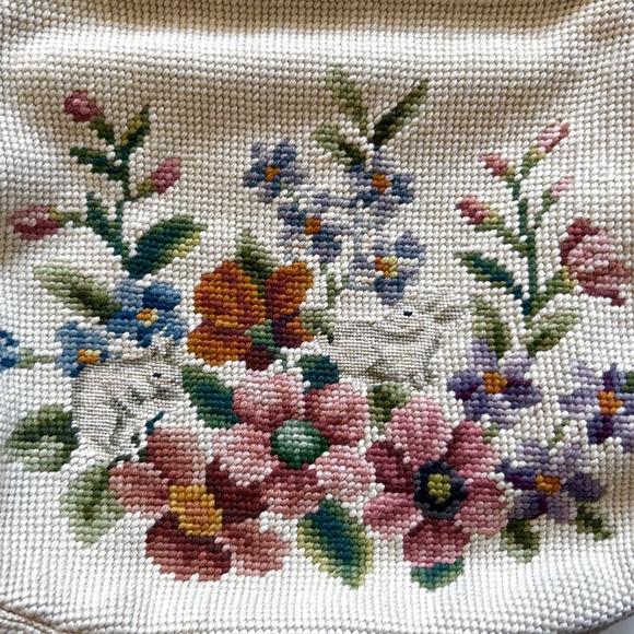 Exterior: Cream needlepoint with detailed floral and bunny embroidery