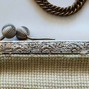 Frame: Silver-tone embossed metal with a kiss-lock clasp and vintage brass-tone chain handle