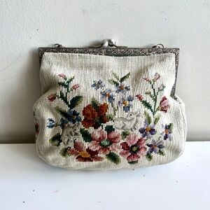 This beautifully hand done Needlepoint vintage handbag by Christine Custom Bags of Detroit, Michigan features an elegant floral tapestry with sweet white bunnies โ the perfect blend of cottagecore charm and mid-century design.