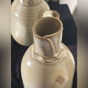 These fascinating little jugs are hand made with finger groves on each jug. Beautiful colours and research suggests them to be a serving dispenser but I have gotten various opinions as to for what. The French say it is for Oil, Water or Wine. A German item like this was for seltzer?