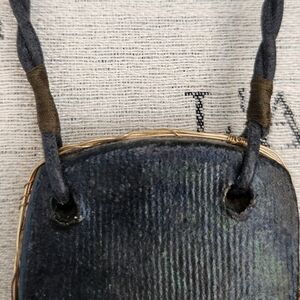 Art style Ceramic Art style pottery breast plate necklace with 2 plait Taura (woven string) waxed black leather strap and genuine yellow gold wire, by EM.
