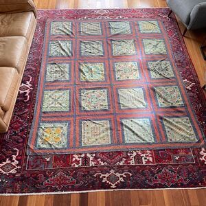 Absolutely stunning - this is the real deal. 100% cotton vintage handmade quilt/throw. The craftsmanship in each square is outstanding - some are also sewn with traditional mirror work and the patterns are all embroidered, not printed. Colours are muted indigo, red and the backing is green. Handmade, with a few wonky stiches and all.