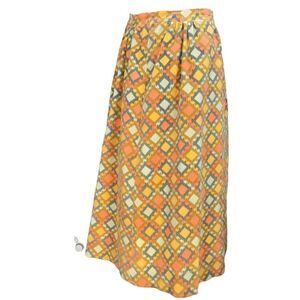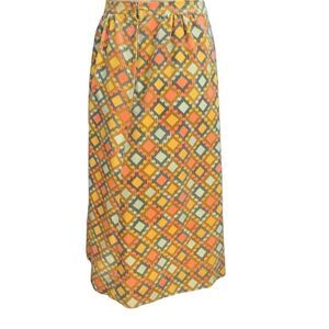 No tags, dates to 1972, lined, midi/maxi, flared, mustard, peach and grey colours, EUC, 37” long, 26” waist, hemline 48”, size is estimated as small, see measurements.
