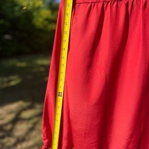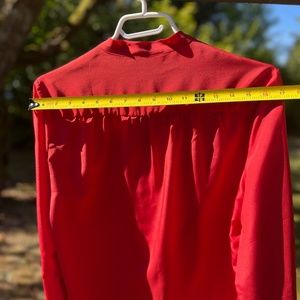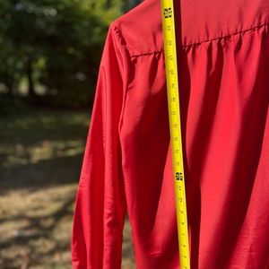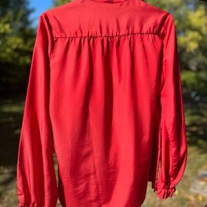 Vintage scarlet blouse. High neck with ruffles and tie, matching buttons. Long sleeves with ruffled hem and button cuff. 100% Polyester.