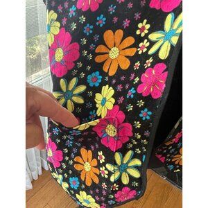 Fabulous hippie flower power vest. Pinwale corduroy, black background with so many crazy daisies of different colors: hot pink, orange, yellow, blue... very bright and vibrant! Small pocket on one side, no closure.