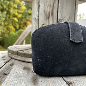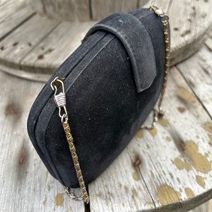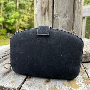 Vintage inspired shoulder bag. Rigid exterior in kind of black velvet / suede. Silver chain strap. Snap closure. Small zippered compartment inside. Approximatively 7 x 5 x 2 1/2 inches.