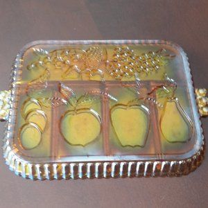 Vintage iridescent Carnival Glass divided fruit dish. This vintage divided dish has a beautiful embossed fruit motif and nice size, button style handles for fumble free handling. This server measures 12 5/8" x 8 7/8" No chips or cracks. Excellent pre-loved condition.