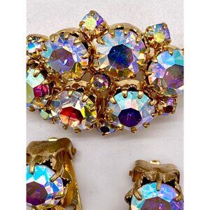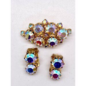 Unsigned Beauty!! Vintage 50's jewelry set, brooch and clip on earrings in Aurora Borealis, crystal pink/blue/purple rhinestones and gold-tone metal. This set sparkles and shines! It's in excellent used condition and would be a great addition to any vintage collection.