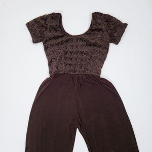 Vintage jumpsuit brown wide leg loose t-shirt bodycon fit flare scoop neckline