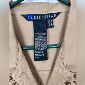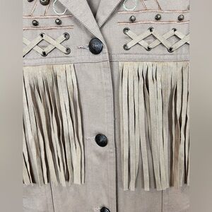 I.B. Diffusion 1993 cotton tan denim oversized jacket, size 14 with decorative studs, western-style embroidery, faux suede fringe, soft shoulder pads (removed but included with purchase) and side pockets. Some minor pinpoint stains on the sleeves near cuff, see photo. (True Color is the first full length photo)