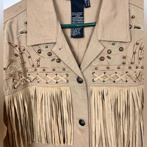 Vintage khaki denim fringe western jacket, 14, studs, embroidery Cowboy Rodeo
