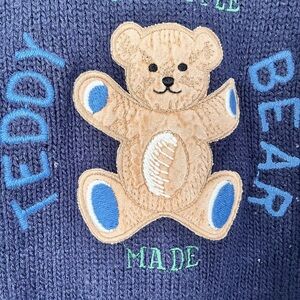 Cozy navy sweater with a cute teddy bear design. Features colorful embroidery.