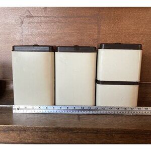 Vintage Kitchen Canisters. Set of 4. Floral print made by Ecko in Canada. They are tin with plastic lids that fit well. There are 2 of each size Please see the pictures close up for wear and tear. The pictures are part of the description in terms of shape. They are in, what I would consider, very good vintage shape.