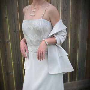 Perfect for that upcoming wedding, business function, theatre outing. Classic fitted blazer with quietly sexy matching knee length dress in soft oyster colour. No tags, dress chest measures 40 inches, waist 36, hip 40. The beaded top drops to just above the hip, with spaghetti straps and squared off neckline. Invisible zipper close. Top fully beaded with exquisite opalescent beads front and back. Fitted jacket with covered buttons, faux pocket detail, 17 inches across the shoulder. Both pieces fully lined. Clearly well and expensively made. Excellent vintage condition with no wear or missing beads detected. Freshly dry cleaned. Add finishing details from Our Closet (some suggestions shown all listed and priced separately). There's always something fresh at Lemon Squeezy Shop🍋