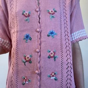 Gorgeous vintage knit cardigan with flower details and checkered sleeves/collar. So cute, perfect condition! Size L but can fit anywhere from S-L. Cotton blend, soft comfortable material.