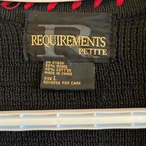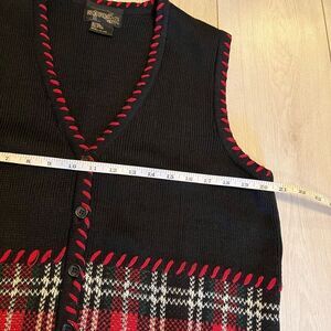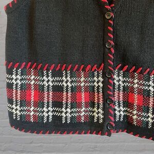 Super cute vintage knit vest. Cotton/ramie blend knit sweater vest with buttons. Black with red threading and plaid band. Size large. True to size. Great condition, some loose threads.