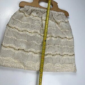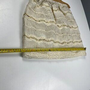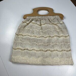Vintage knitting bag with a unique woven woods handle, handmade with care in a medium size. This top handle bag features a cream exterior and lining. Made from knit fabric with a polyester exterior material, this bag is perfect for any woman looking to add a vintage touch to their wardrobe.
