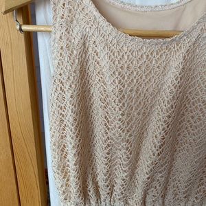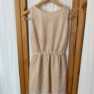 Cute sleeveless lace mini dress in nude with tan lining. Looks great with a black Doc or a colourful slip on