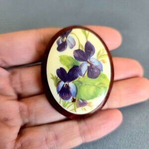 Vintage large oval plastic and wood cameo brooch with blue violet pansy flowers.