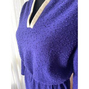 Gorgeous late 60s dress, purple with white trim, long sleeves with a deep V neckline. Waist is elastic and it has loops for a belt, not included. Union made by R&K originals