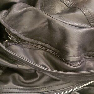 Vintage (1989) black leather motor cycle jacket, from leather ranch, size 3 (medium), unisex, belt, three zip pockets, removable arms.