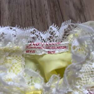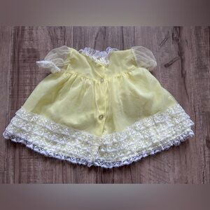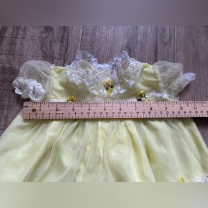 Adorable yellow baby dress with lace details and bow accents. Perfect for special occasions.