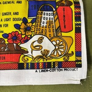 Vintage linen Traditional Recipes of Scotland tea towel. A vibrant piece of kitchen decor featuring clootie dumpling, Dundee cake, forfar bridies, c**k a leekie, and Scots gingerbread. In new, unused condition