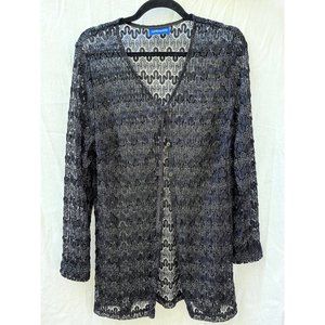 Vintage Addition-elle long lacy knit button up cardigan in black. Has a slight sparkle detail in every second row.
