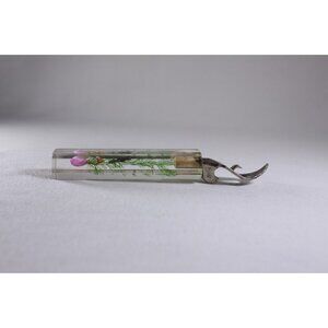A vintage tourist souvenir bottle opener but without a location on this one. The little seahorse trapped inside the lucite / acrylic transparent handle is not real. Perfect for your mid-century themed bar or home! Size: 13.7 cm long (5-3/8 inches)