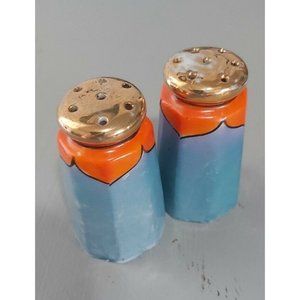Vintage lusterware salt and pepper shakers, made in japan, Art deco style, orange and blue, hand painted. In fair condition. The gold on top is a little faded as shown in photos. Has original stoppers but they are stuck inside. 2 inch tall. Miniature set. Has no chips or cracks. Add these beauties to your collection today!