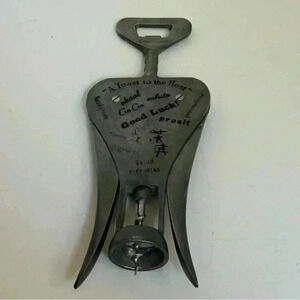 Vintage made in Italy 1950’s Barman corkscrew. This large corkscrew still works. It’s in fair preowned condition with paint wear. The reverse side has toasts in various different languages. This is a really fun addition to any vintage bar, particularly if you’re a fan of midcentury