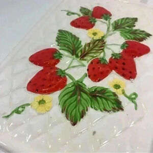 Vintage made in Japan ceramic strawberries decorative trivet / wall hanging. This delightful piece is shaped like a quilted potholder with wonderful painted strawberries. It has a hole to hang it from. There are some scuffs on the corners and a few chips scattered throughout, but nothing to detract from its charm. No cracks or other paint wear