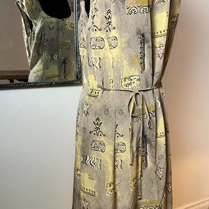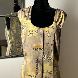 Sleeve less maxi vintage dress with buttons, colours sandy, black, brown with abstract prints, made in polyester, has a incorporated belt ruban, beautiful neckline