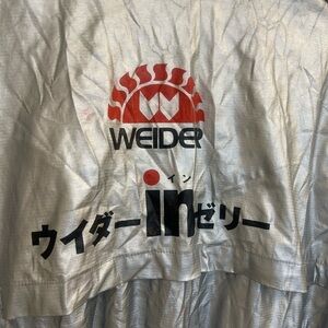 Vintage men’s L -XL Weider Japanese silver and black moto style bomber Great used condition given age- some stretching on shoulders makes it even better IMO
