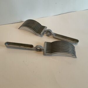 These roast forks are made of aluminium measure 10 1/2” by 2” by 2 1/4” and are detachable. Great nostalgic kitchen item to add to your collection but can also be used to slice your meat evenly. Clasp the handles, securing the roast and slice away.