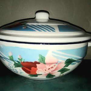 Vintage from 1950's Bumper Harvest made in China Enamel casserole dish/pot with lid