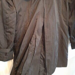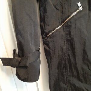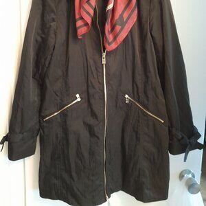 Vintage mid-length Karl Lagerfield Paris windbreaker raincoat jacket with hood rain that can be hidden. size Medium. Perfect for spring, summer and fall. It has been worn a few times only and has no signs of wear. The coat has just been washed, but not ironed, and is ready to ship. Cute Stylish Marie-Claire scarf will be given with the purchase of this jacket. Gold tone zipper and hardware. The coat is made of nylon and the neck style is funnel.