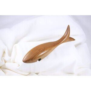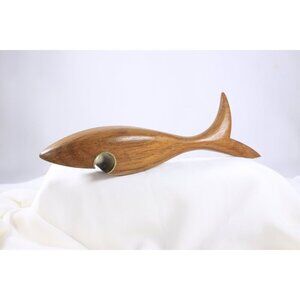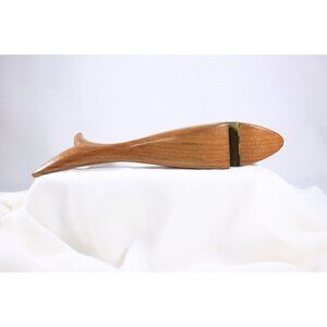 A beautiful and elegantly shaped wood carved shark, the open mouth underneath fitted with a curved piece of metal to function as a bottle opener. No eyes or further detailing, apart from the smooth curved line of the body and tail. An elegant piece of midcentury decor, the wood likely a teak. With a small loss to the bottom tip of the tail (pictured). Size: 8-3/8 inches long (ca 21 cm)