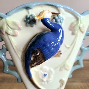 Vintage narrow ceramic vase with 3D exotic bird and handles.