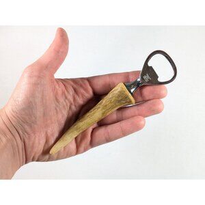 An older bottle opener, the smooth pointed handle is made from natural antler. The opener part in a glistening silver tones metal - marked Stainless Steel Sheffield England.